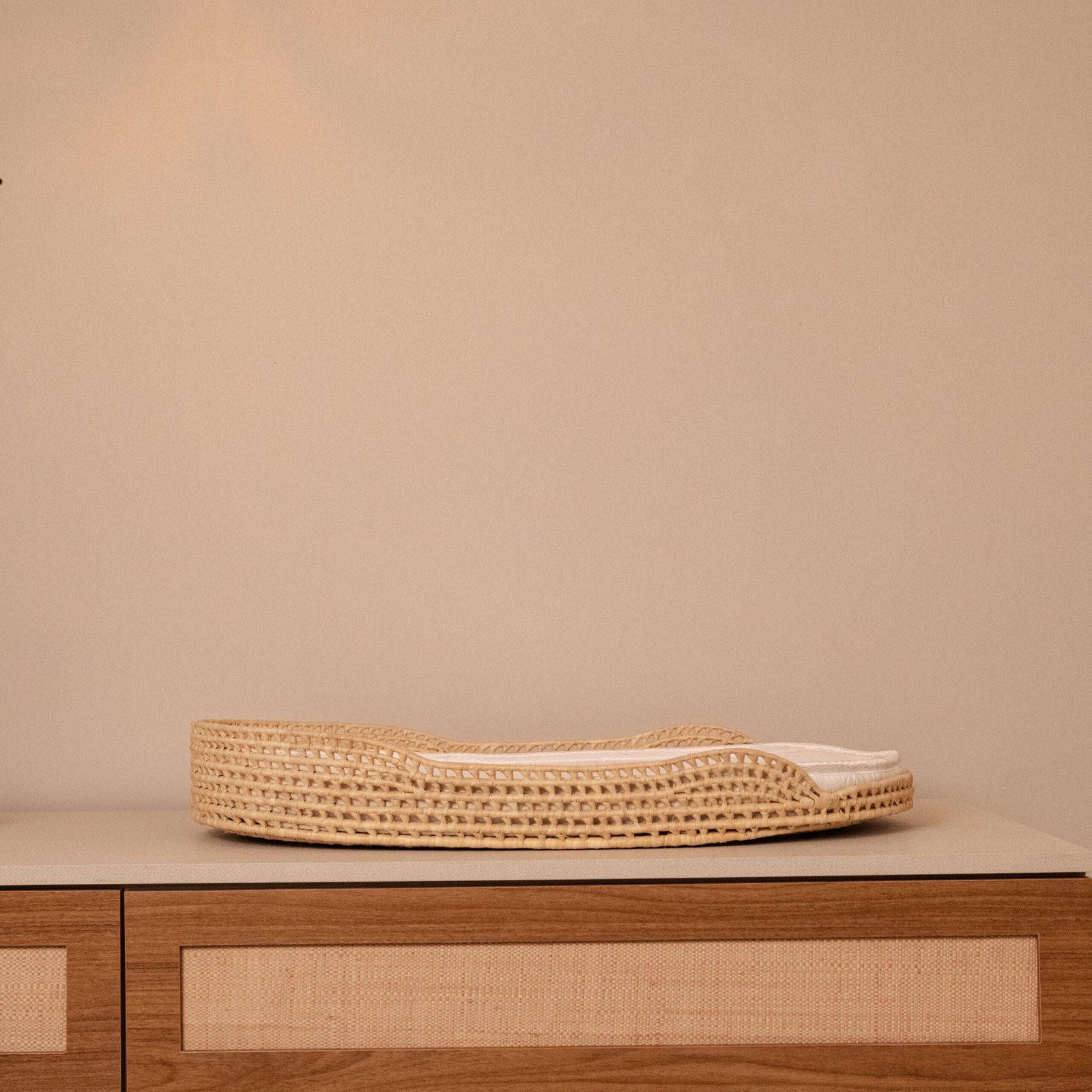 Proporcione ao seu bebê momentos de troca de fraldas mais confortáveis e seguros com nosso trocador em palha Aconchego. Feito à mão com palha de carnaúba, um material natural e respirável, ele garante um ambiente macio e acolhedor para o seu pequeno. Seu design exclusivo e atemporal se adapta a qualquer decoração, trazendo um toque de natureza para o quarto do bebê.